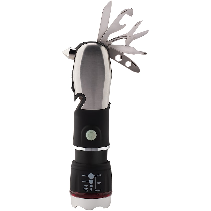 Torcia con tanti attrezzi integrati. Holbrook ha tre diverse modalità di illuminazione con anche funzione zoom. È alimentata con 3 pile AAA (non incluse).