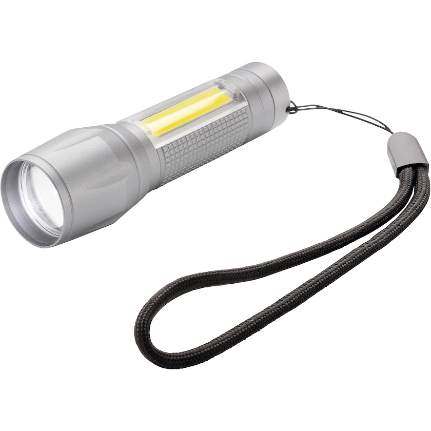 Potente torcia dal piccolo formato. Questa torcia è realizzata in alluminio ed è dotata di una lampadina LED e di una lampadina COB. Ha tre diverse modalità di illuminazione. Batterie incluse.
