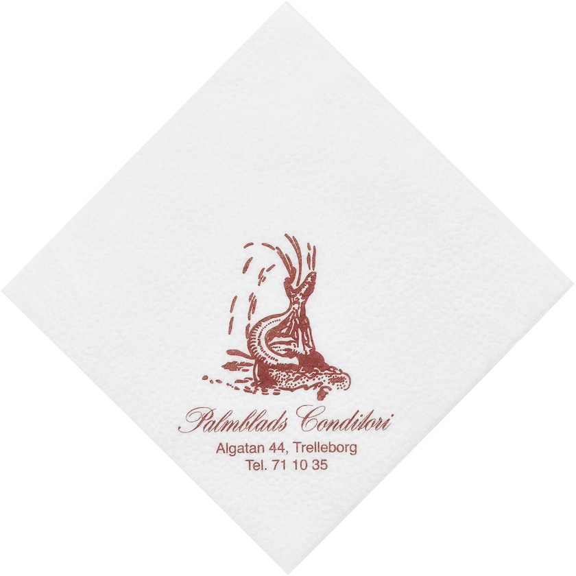 Tovagliolo da cocktail Tork a un velo. Ogni tovagliolo viene consegnato piegato in quattro e così misura 12 x 12 cm, mentre quando è disteso misura 24 x 24 cm. L'intero lato superiore può essere personalizzato secondo i tuoi desideri. Le dimensioni del tovagliolo si adattano perfettamente a bar e caffè che servono cibo leggero e bevande. Questi tovaglioli sono certificati EU Ecolabel, sono cioè realizzati in fibra riciclata proveniente al 100% da foreste gestite in modo sostenibile. Sono anche Food contact approved 4764801. I prezzi si riferiscono a unità da 1000 pezzi.