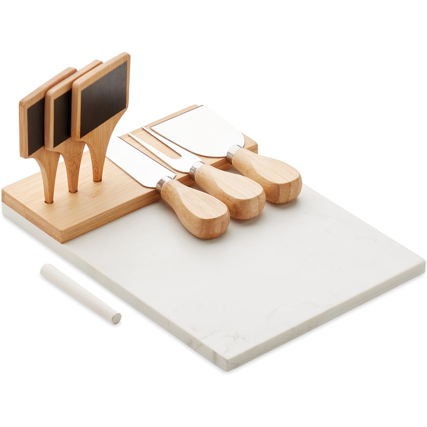Tagliere da formaggi in marmo e bambù con coltelli da formaggio e cartellini abbinati. Un lussuoso regalo per tutti gli amanti del formaggio. I cartellini ti permettono di indicare in modo semplice i vari tipi di formaggio o snack. 1 gessetto incluso. Il set viene consegnato in una confezione regalo. L'incisione a laser viene realizzata sulla parte in bambù.