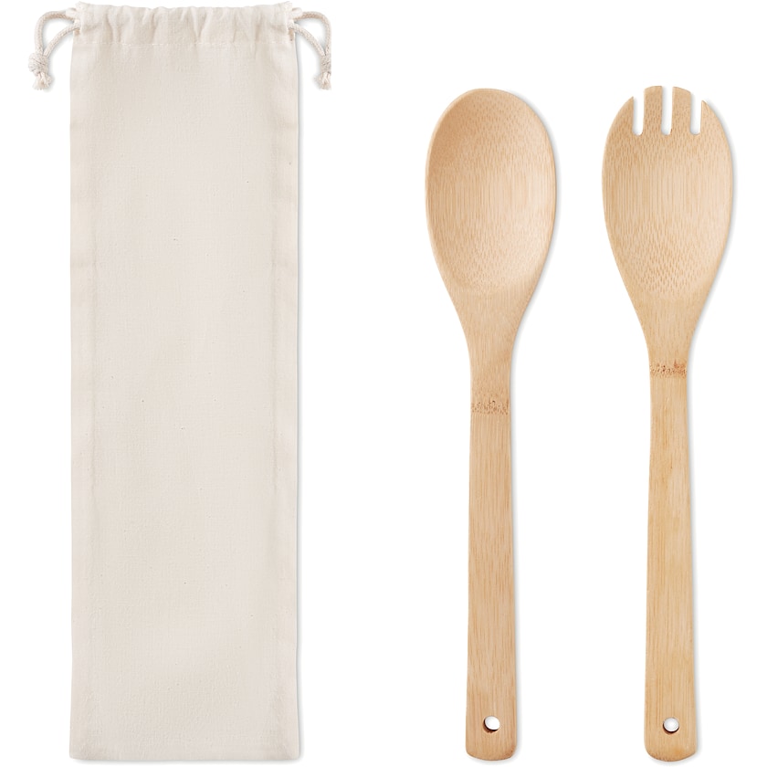 Posate da insalata in bambù. Vengono consegnate in una busta color naturale. La stampa viene realizzata sulla busta, mentre l'incisione su una delle posate da insalata. Il bambù è un materiale naturale, quindi il colore può variare leggermente.-