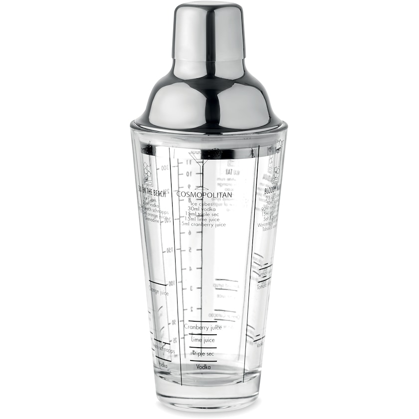 Shaker per cocktail in vetro con tappo in acciaio inox. Sul vetro sono stampate le ricette per i cocktail e le dosi. Un regalo perfetto per tutti quelli che apprezzano un buon drink.