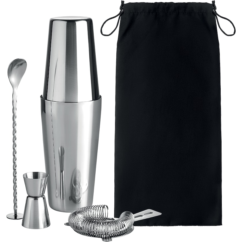 Set da cocktail per preparare drink perfetti. Un bel set per chi ama preparare (e bere) dei buoni drink. La stampa può essere realizzata sulla custodia (in quattro colori al massimo su una superficie di stampa di 150 x 100 mm) oppure sullo shaker (stampa a un colore su una superficie di stampa di 180 x 70 mm).