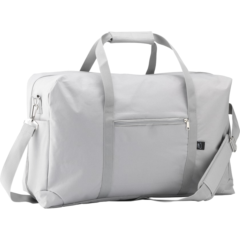 Pregiata borsa da viaggio in materiale ecologico. Draper è realizzata con bottiglie di PET riciclate. Questa borsa può essere aperta completamente così da poterla riempire più facilmente. Oltre allo scomparto principale, include anche due scompartimenti separati dotati di cerniera. Inoltre, all'interno si trova una tasca separata per trasportare un computer da 13 pollici in sicurezza. La tracolla è rimovibile. È solo possibile la stampa a un colore.
