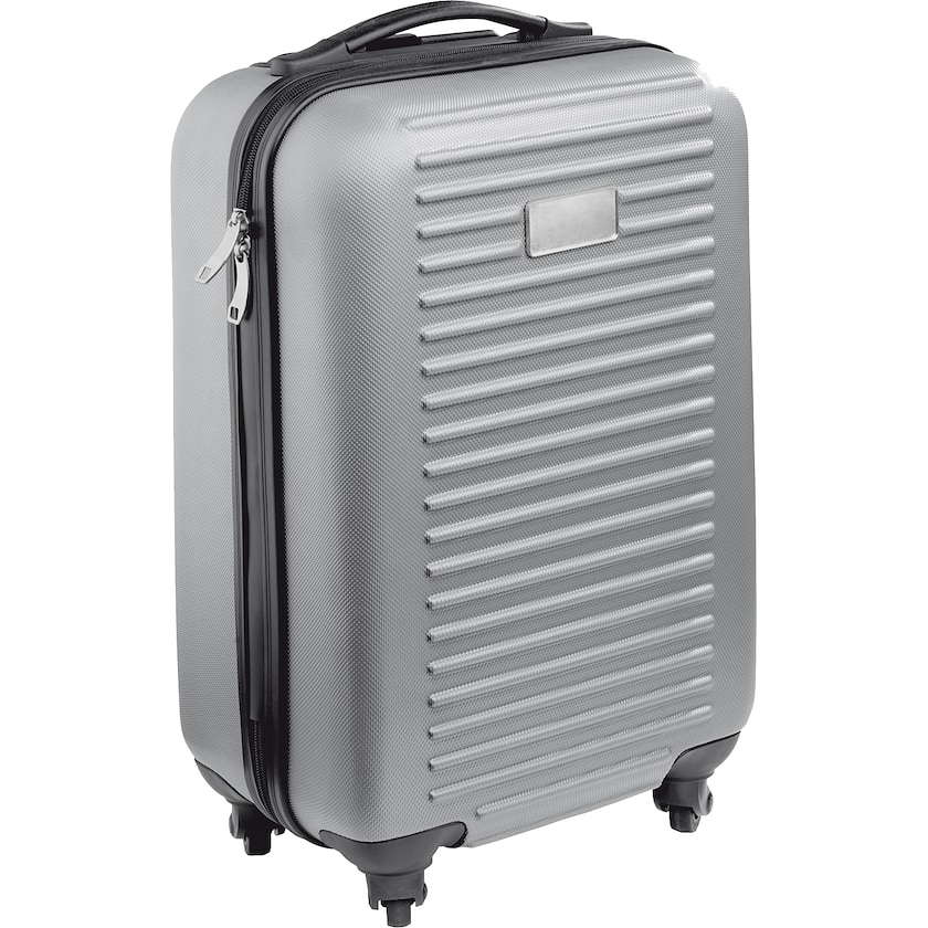 Trolley in formato compatto disponibile in tanti colori diversi. Questo trolley è dotato di quattro ruote e doppia cerniera. La personalizzazione viene realizzata sulla targhetta di metallo posizionata sul lato anteriore. La stampa è ricoperta da uno strato protettivo di resina epossidica che le dà un aspetto più pregiato.