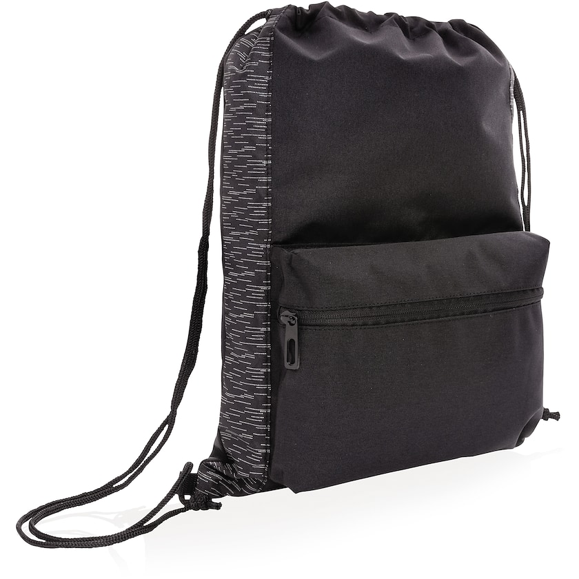 Sacca sportiva con lati catarifrangenti. Sul davanti si trova una tasca con cerniera. La sacca è realizzata in rPET, ossia in bottiglie di PET riciclate.
