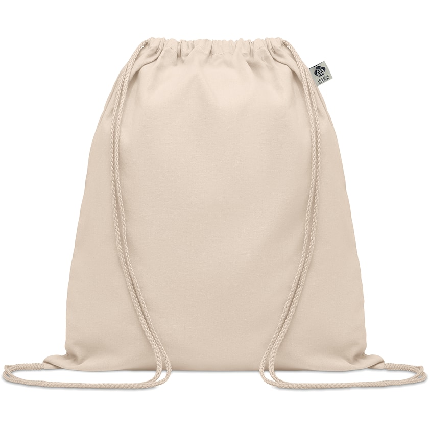 Sacca in cotone biologico color naturale. Il tessuto pesa 140 grammi/m². Su di un lato si trova un'etichetta che indica la composizione della sacca in cotone biologico.