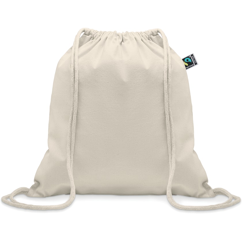Sacca in cotone certificato Fairtrade. Il tessuto pesa 180 grammi per m². Su un lato si trova un'etichetta che mostra che la sacca è realizzata in cotone certificato Fairtrade.
