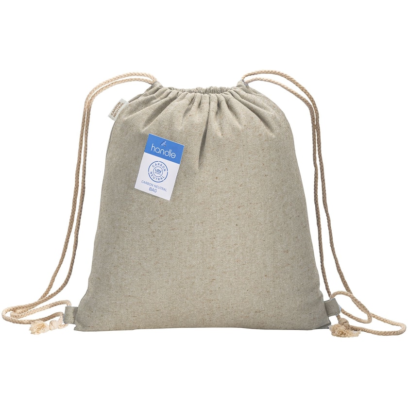 Sacca sportiva con tessuto mélange in cotone riciclato. Gisele è realizzata in tessuto resistente da 280 grammi con cordini color naturale. Un'etichetta posizionata sulla sacca indica che la produzione di questo tessuto avviene a emissioni zero.