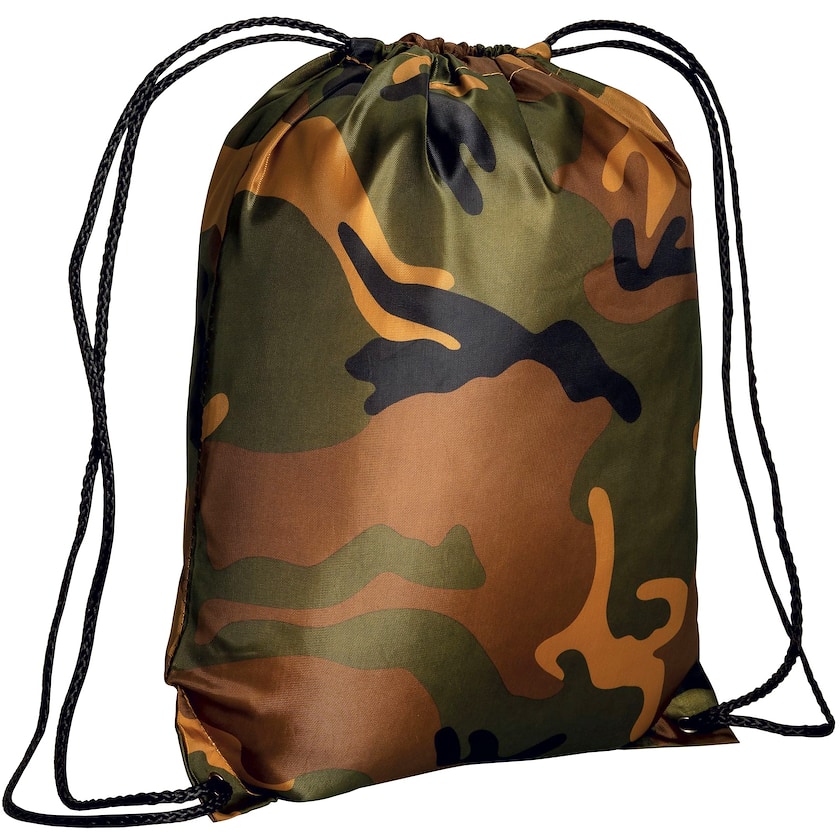 Sacca sportiva personalizzata con tessuto mimetico. Questa sacca mimetica è realizzata in poliestere resistente ed è dotata di angoli rinforzati. La stampa può essere realizzata al massimo in due colori.