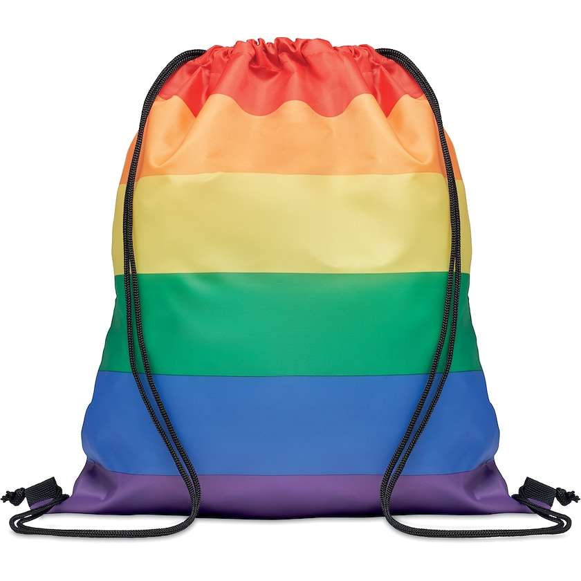 Sacca arcobaleno personalizzata. Molina è realizzata in rPET 210D, cioè in un materiale ecologico prodotto con bottiglie di PET riciclate. I cordini sono realizzati in polipropilene.