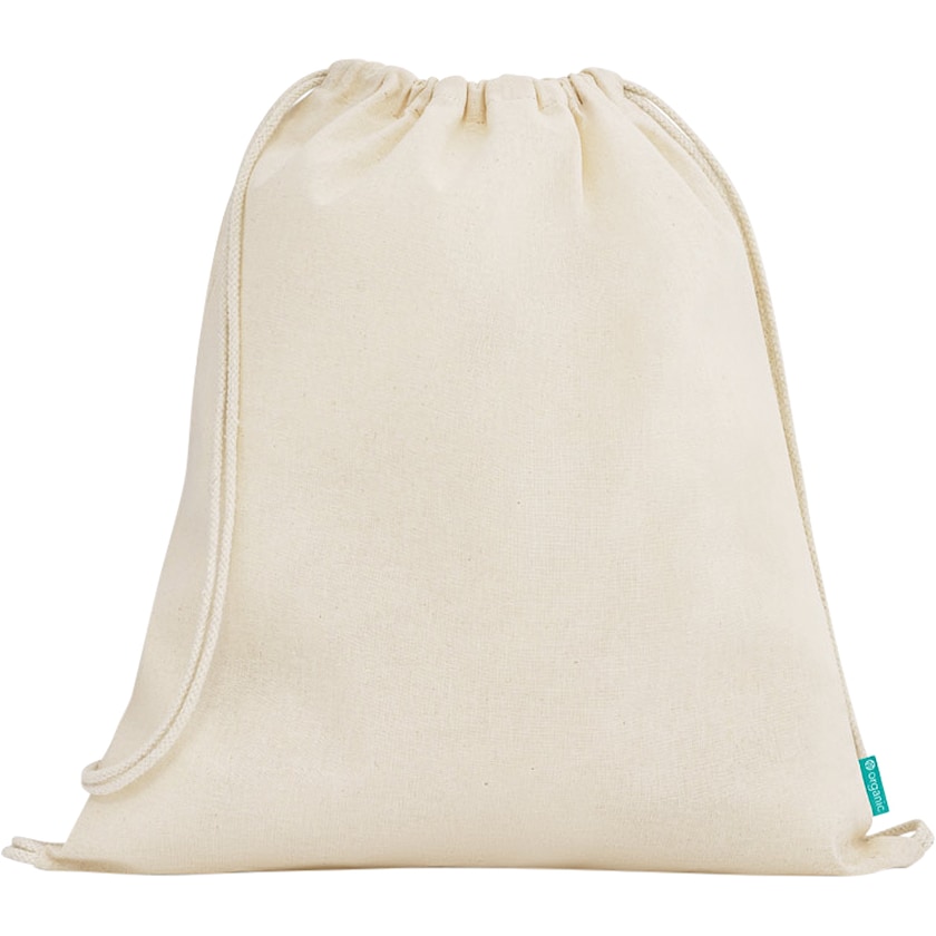 Sacca in 100% cotone biologico. Su di un lato si trova un'etichetta con la scritta "organic". Il tessuto di cotone è realizzato senza nessun pesticida chimico.
