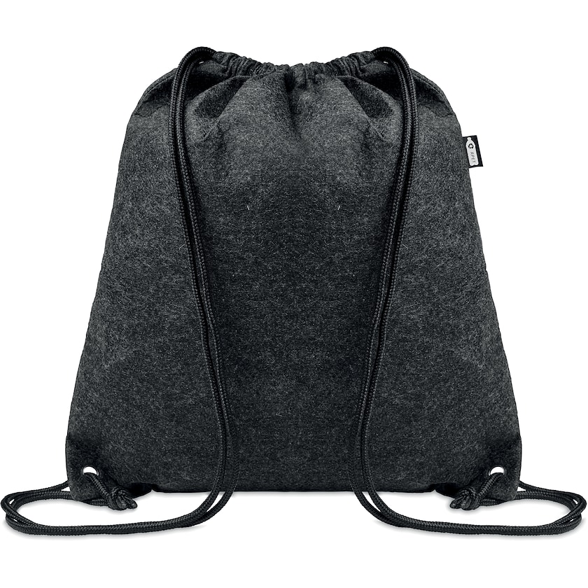 Sacca ecologica in tessuto di feltro. Il tessuto è realizzato in rPET (bottiglie di PET riciclate), mentre i cordini sono in poliestere. Su di un lato si trova un'etichetta che indica la composizione del tessuto in rPET.