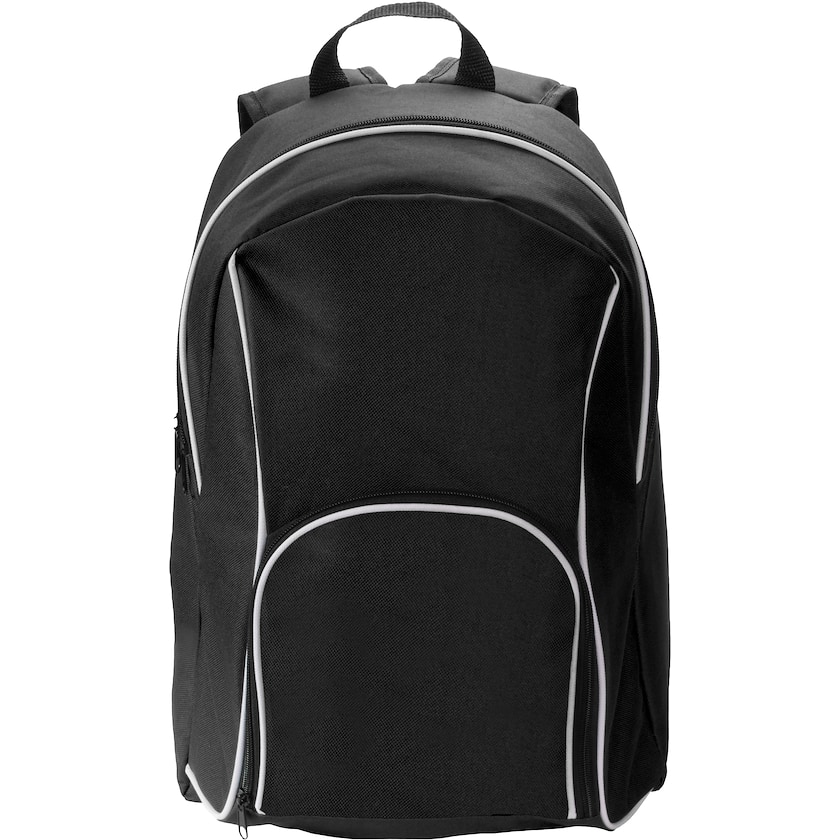 Zaino con bordi a contrasto. Alaska è realizzato in poliestere ed ha numerose tasche con zip. Con spallacci e schienale imbottiti.