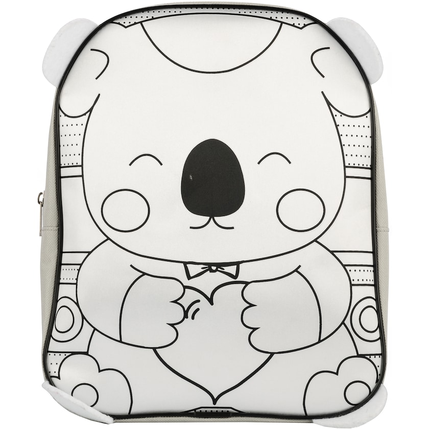 Zaino per bambini con un koala sul lato frontale. Sono inclusi 6 pastelli colorati per colorare il koala. Lo zaino è di piccole dimensioni ed è destinato ai bambini. Gli spallacci sono regolabili e sulla parte parte superiore si trova una maniglia per il trasporto.