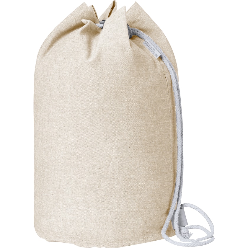 Sacca da mare in cotone riciclato. Su di un lato si trova un'etichetta che ne indica la composizione in cotone riciclato.