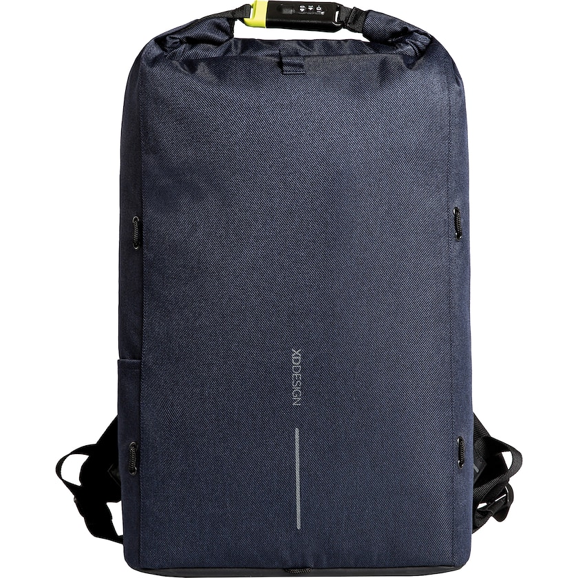 Zaino per portatile unico con funzione anti-furto. Lo zaino può essere chiuso arrotolando lo scomparto principale e bloccandolo con una serratura a combinazione rinforzata in acciaio. Il lucchetto può essere utilizzato anche per bloccare lo zaino su un altro oggetto. All'interno e nella tracolla sono nascosti vani portaoggetti protetti da RFID. All'interno c'è uno scomparto imbottito che contiene la maggior parte dei portatili fino a 15,5 pollici e un comparto imbottito per tablet fino a 12,9 pollici. Design registrato®.