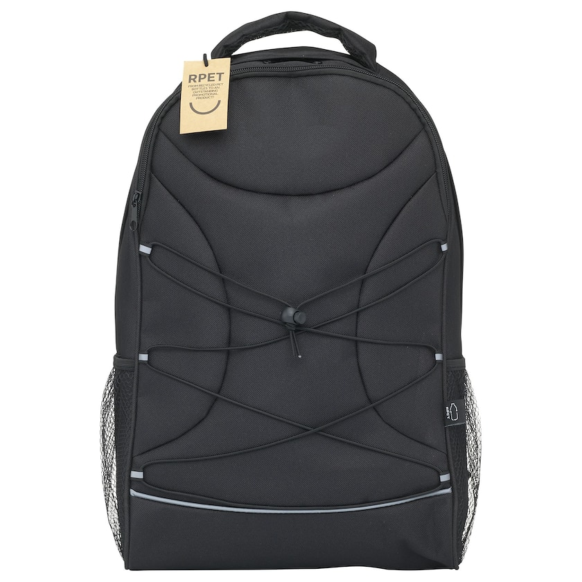 Zaino porta PC ecologico. Questo zaino è realizzato in rPET (bottiglie di PET riciclate). All'interno si trova uno scomparto imbottito per PC da 15,6 pollici. Gli spallacci e lo schienale sono comodamente imbottiti. È solo possibile la stampa a un colore.