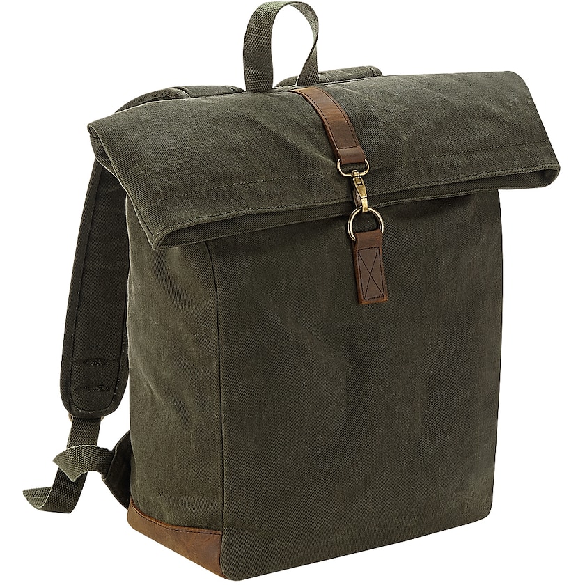 Zaino per portatile realizzato in tessuto di cotone cerato con dettagli in vera pelle. All'interno c'è uno scomparto imbottito che tiene la maggior parte dei portatili fino a 15,6 pollici. Lo scomparto principale è dotato di cerniera e lo schienale è imbottito.