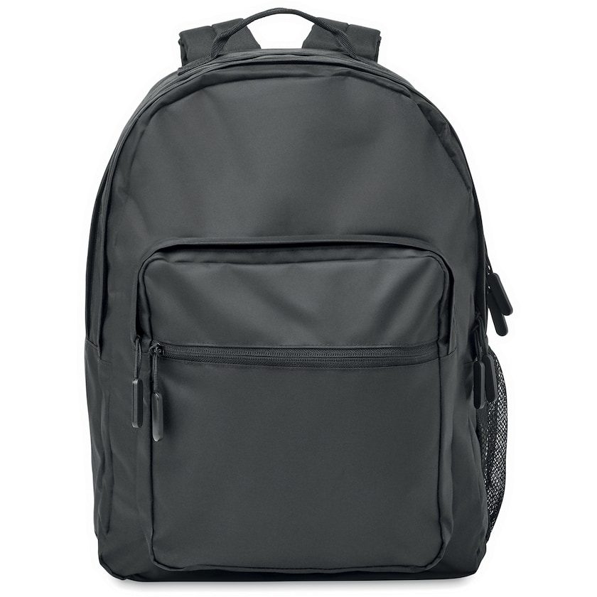 Zaino porta PC personalizzato in tessuto riciclato RPET. All'interno si trova una tasca imbottita per PC da 15 pollici. Lo zaino ha due grandi tasche dotate di cerniera, doppie tasche sul davanti e tasca a rete laterale. Il retro e gli spallacci sono imbottiti.