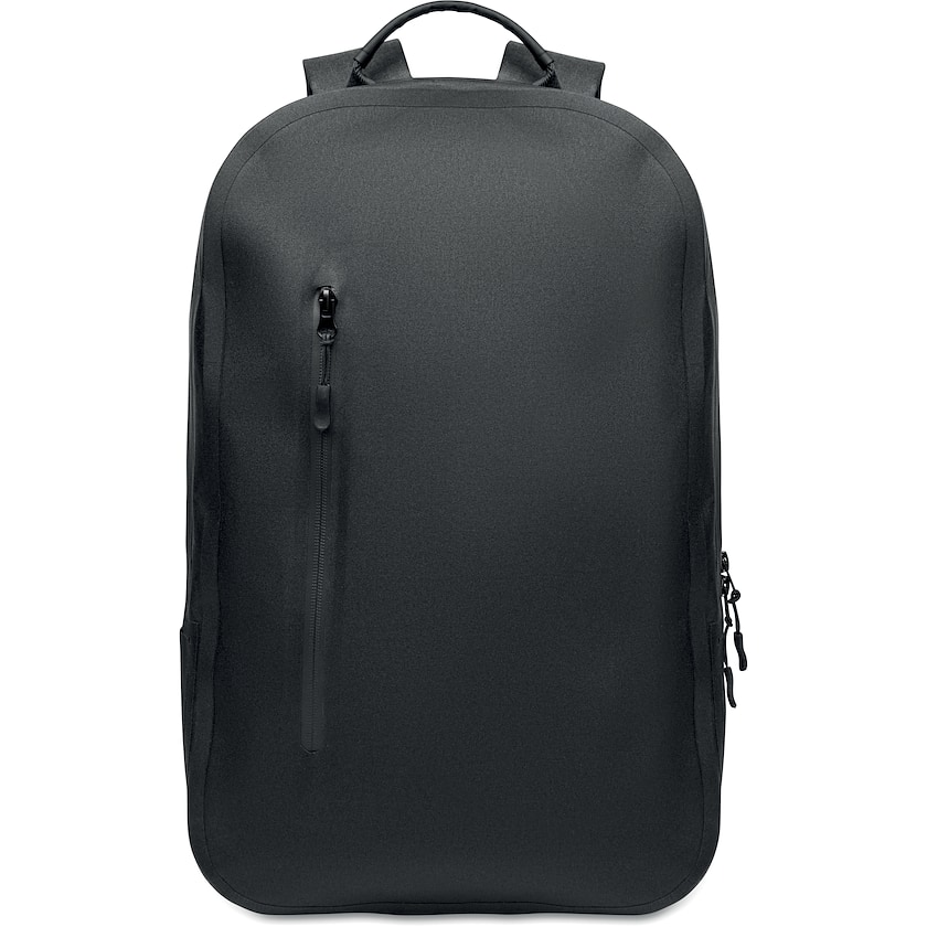 Zaino porta PC con tessuto idrorepellente. All'interno si trova uno scomparto imbottito per PC da 16 pollici. La superficie esterna è realizzata in rPET ecologico. Sul davanti si trova una tasca con cerniera.