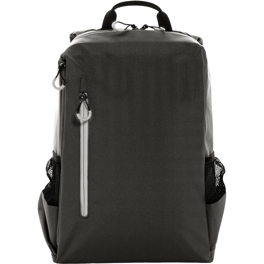 Zaino porta PC personalizzato. Stewart contiene uno scomparto imbottito da 15,6 pollici. Sul davanti si trova una piccola tasca dotata di cerniera, mentre sui lati si trovano delle tasche per borraccia. Il tessuto è realizzato in 100% poliestere riciclato.