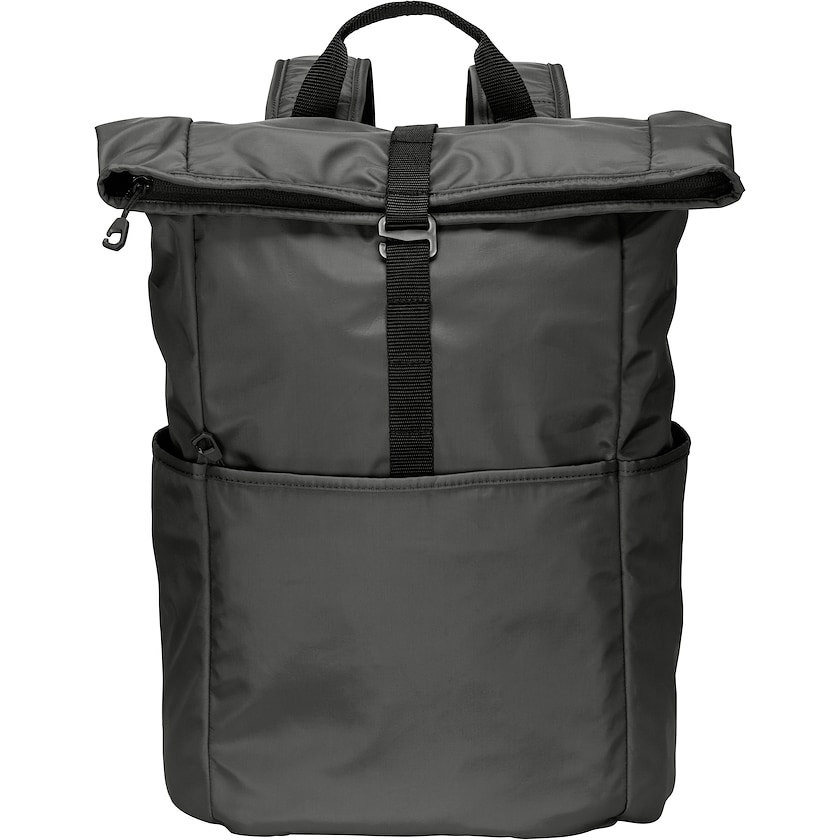 Zaino arrotolabile in materiale resistente. All'interno si trova uno scomparto imbottito per un PC da 15 pollici. Un gancio in metallo tiene lo zaino chiuso quando è arrotolato. Sul davanti si trova una grande tasca con cerniera e ai lati delle tasche laterali. Lo schienale e gli spallacci sono imbottiti e realizzati in materiale traspirante per un massimo comfort.