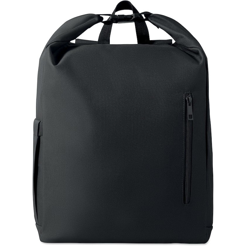 Zaino roll top in rPET ecologico. All'interno si trova uno scomparto imbottito per un PC da 15 pollici. Sul davanti si trova una tasca dotata di cerniera e su un lato una tasca elastica.