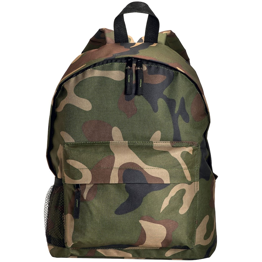 Zaino mimetico personalizzato. Oltre allo scomparto principale, questo zaino è dotato anche di una tasca anteriore dotata di cerniera. Su di un lato si trova una tasca a rete. Lo schienale e gli spallacci sono imbottiti. È solo possibile la stampa a un colore.